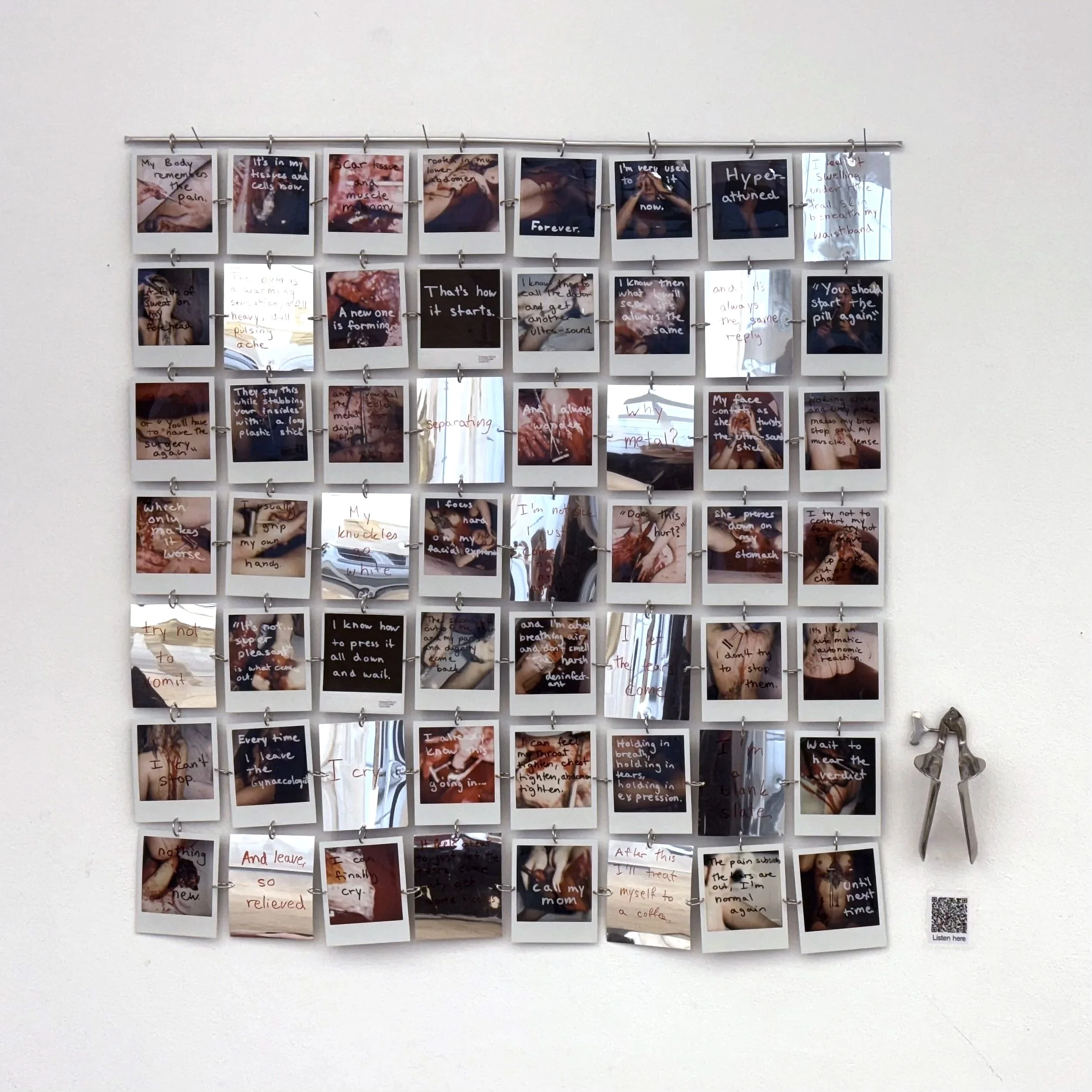 My Body Remembers is collaboration between Avélina de Ment (words, voice) and Helen Hines (polaroids, sound). This piece explores the body, endometriosis, and sterile medical spaces — transferring embodied pain and memory through poetry, photography & sound. It was first exhibited at the University of the Arts Berlin Rundgang, but was taken down for censorship reasons. The artists turned it into a guerrilla performance piece, different people carrying it and walking around the University with it, to reveal the stigmatization of female bodies and menstruation.