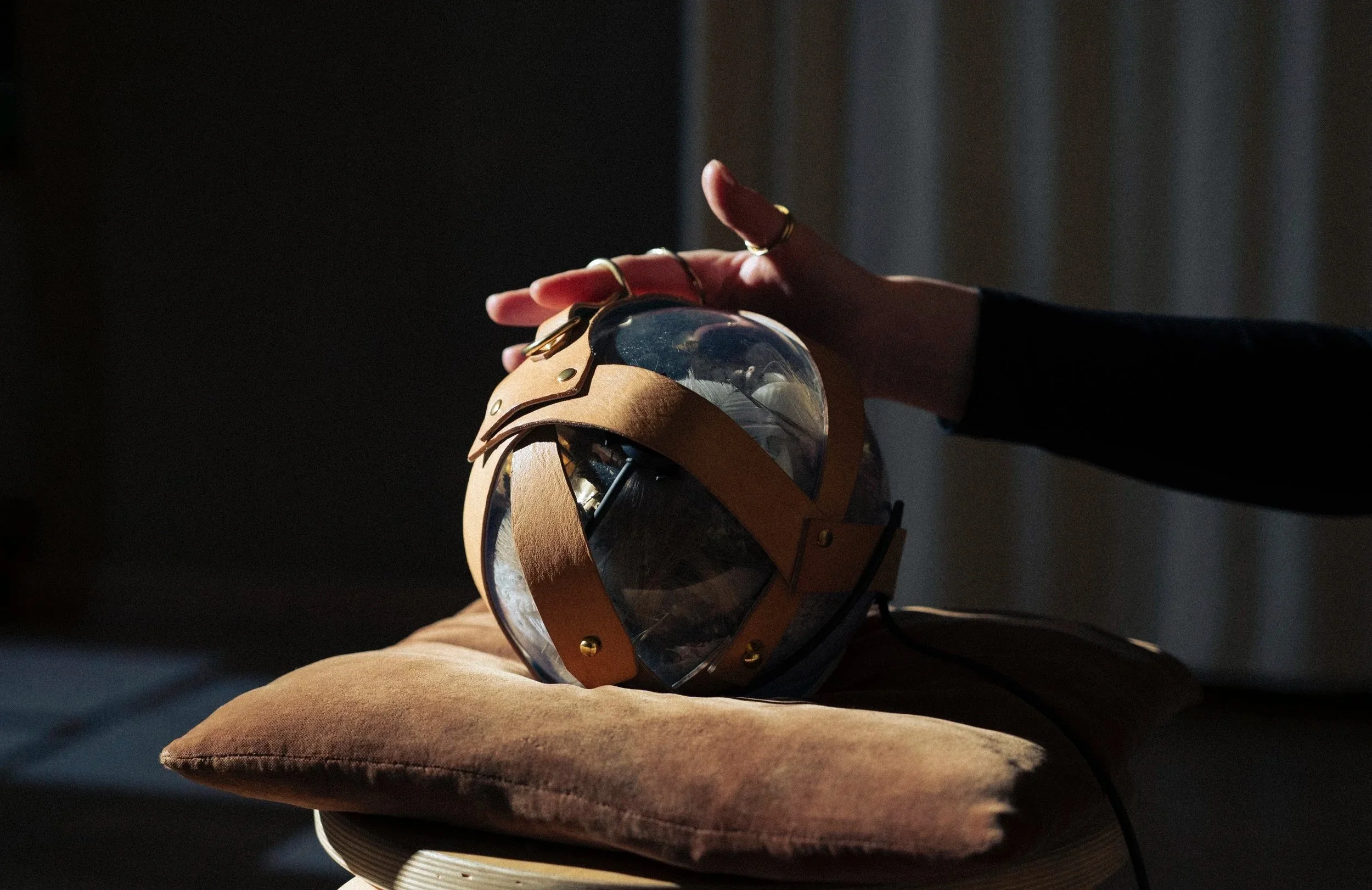 At the heart of the performance is Bone Milk, a ritualistic sound sculpture that functions as both object and presence. The piece consists of a plexiglass sphere encased in leather, filled with an assemblage of materials — seashells, sand, rice, salt, quartz and alpine stones, dried flowers and grasses, a crinkled note, a clay face painted gold, and other remnants whose origins hover between personal, natural, and mythic. As the dancers engage with Bone Milk, it becomes a vessel of memory and decay, resonating softly with movement and sound.